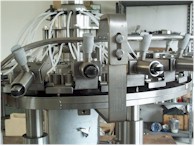 Suitable for the internal rinsing of new bottles. It is completely manufactured in stainless steel and plastic materials with high mechanical resistance and particulary resistant to the acid. Princer rotation system with rail guide (twist) with central liquid distribution adjustable to increase and decrease the spraying times, The princers are complettely manufactured n stainless steel with bottle gripping pad in EPDM rubber. In case of absence of the container, a safety device stops the flow of the liquid avoiding any waste. The same machine can be used for the sterilization of the bottle applying second washing station. The same system can also be equipped with the recycling of the spraying liquid by means of a recycling tank with a pump in stainless steel AISI 316. The micro-filtration grants the integrity of the recycled product. The carrousel can be adjusted in height by a selector switch on the switchboard different bottle formats. The machine can be supplied as a standalone machine or in a monoblock with the filler and the corker.
